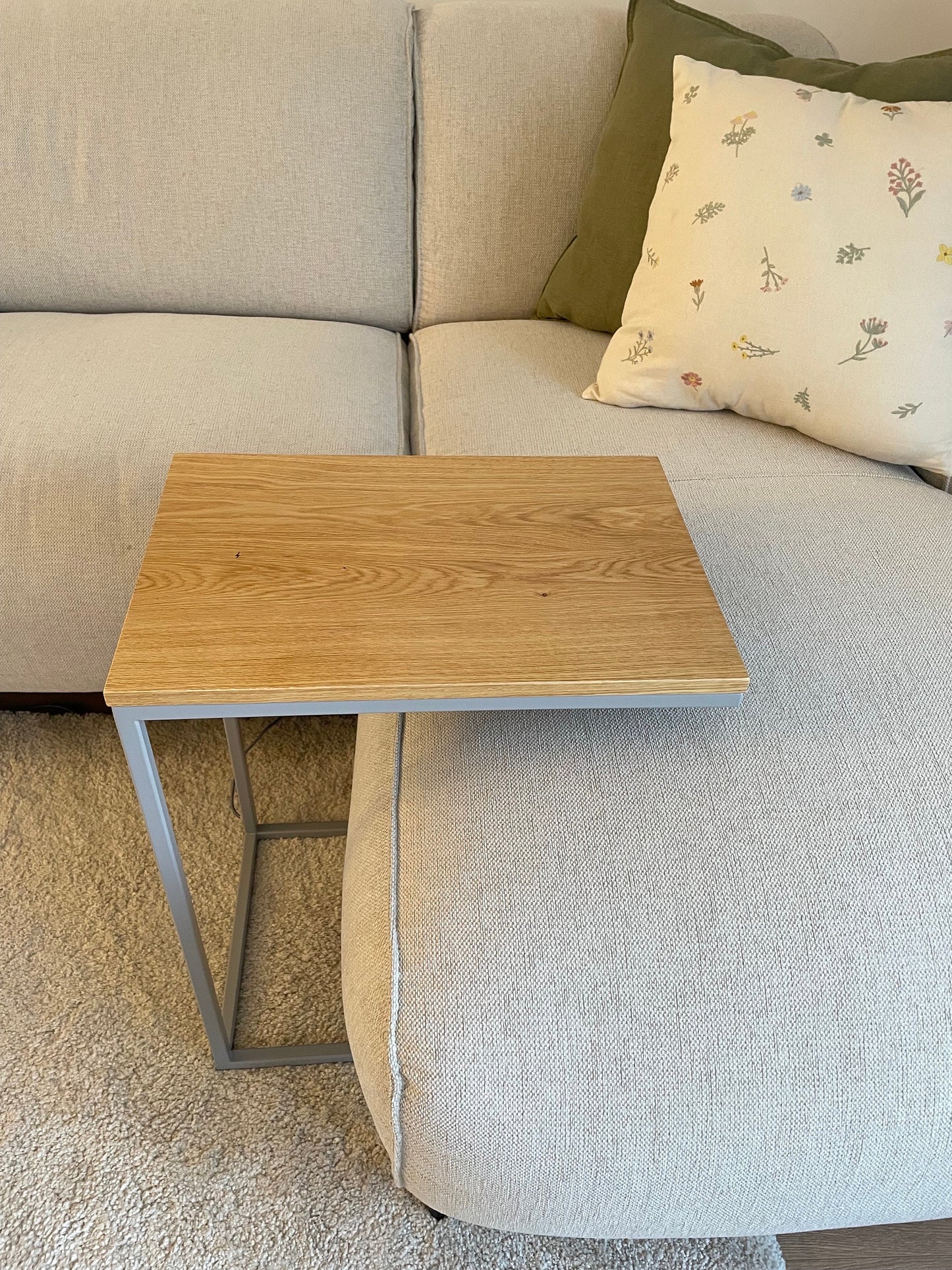 Mit einer Höhe von 60 cm ist der Tisch nicht nur ideal als Couchtisch, sondern auch als stilvoller Beistelltisch einsetzbar. Die Eichenholzplatte besticht durch ihre schlichte Eleganz und die sichtbaren Maserungen, die dem Tisch eine natürliche und zeitlose Ästhetik verleihen. Das handgeschweißte Gestell ist in einer grauen Pulverbeschichtung gehalten, die dem Tisch eine moderne Note verleiht. Auf Wunsch können auch andere Farben für die Pulverbeschichtung gewählt werden, um den Tisch perfekt an Ihre Einrichtung anzupassen.